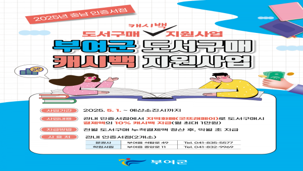 [충청뉴스큐] 부여군이 지역서점 활성화와 독서문화 확산을 위해 5월부터 연말까지 ‘충남 인증서점 도서구매 캐시백 지원사업’을 실시한다.