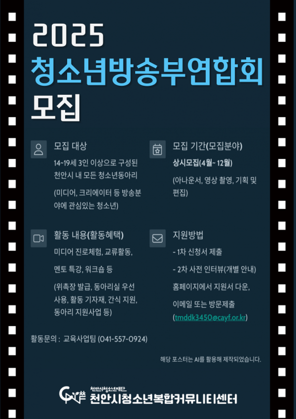 [충청뉴스큐] 천안시청소년재단 천안시청소년복합커뮤니티센터는 청소년방송부연합회에 참가할 중고등학교 방송반 청소년을 모집한다고 2일 밝혔다.