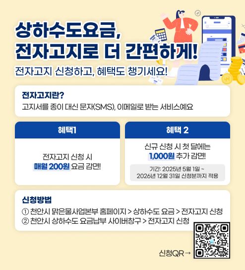 전자고지 신청은 천안시 맑은물사업본부 누리집, 상하수도 요금납부 사이버창구, QR코드 등을 통해 간편하게 신청 가능하다.
