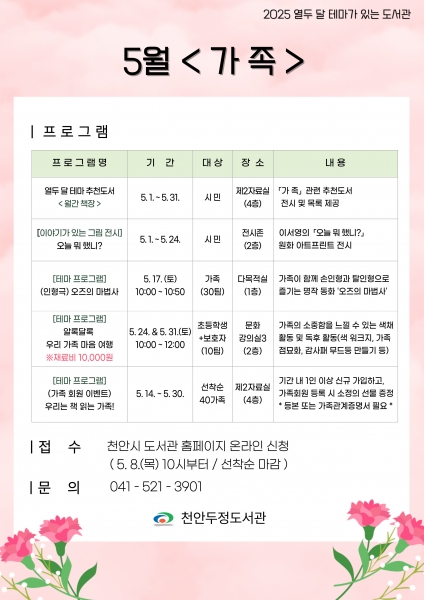 두정도서관 관계자는 “가정의 달을 맞이해 준비한 다양한 프로그램을 통해 가족의 소중함을 느끼고 도서관에서의 즐거운 책 나들이로 추억을 만들 수 있기를 바란다”고 말했다.