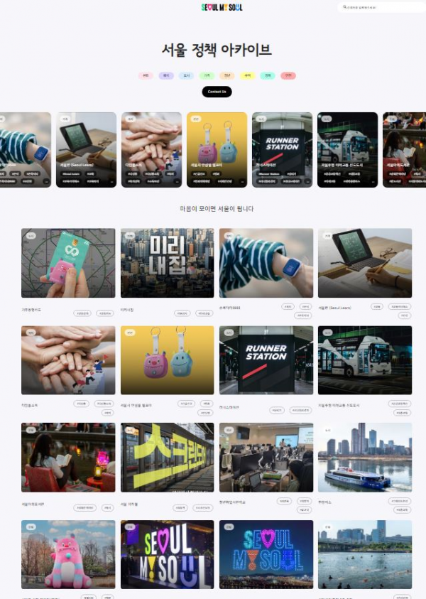 ‘서울 정책 아카이브’는 서울의 주요 정책 정보를 한눈에 볼 수 있도록 이미지, 텍스트, 자료, 영상 등이 통합 안내되는 온라인 채널로 이미지를 중심으로 아카이빙한 것이 특징이다.