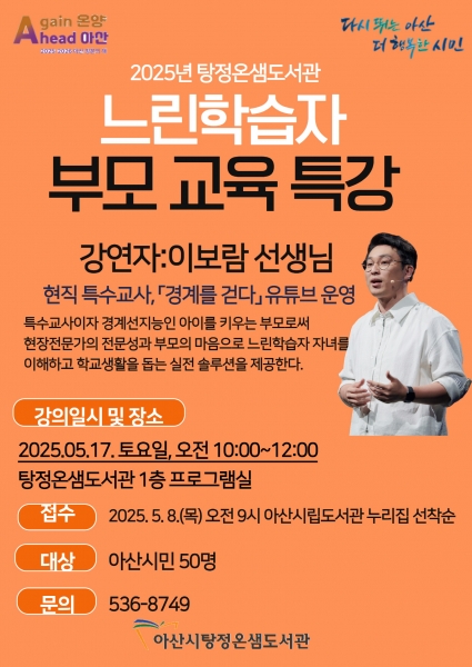 고영이 아산시립도서관장은 “이번 특강은 느린학습자 자녀를 둔 부모님들이 함께 공감하고 지혜를 나눌 수 있는 의미 있는 시간이 될 것”이라며 시민들의 적극적인 관심과 참여를 요청했다.
