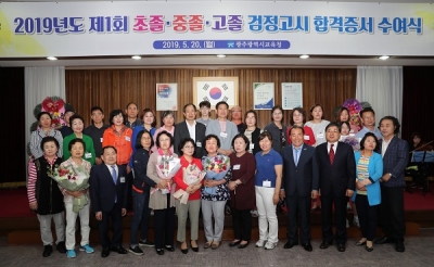 [충청뉴스큐]20일 열린 광주광역시교육청 2019년 제1회 초·중·고졸 검정고시 합격증서 수여식에서 중졸 최고령 71세 김병표 씨와 고졸 최고령 71세 김일심 씨가 직접 합격증서를 받아 교육청 관계자들과 내빈들에게 큰 박수를 받았다.