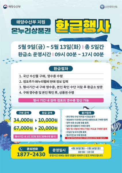 국산 수산물을 대상으로 운영되며 3만 4,000원 이상 구매 시 1만원, 6만 7,000원 이상 구매 시 2만원을 온누리상품권으로 환급받을 수 있다.