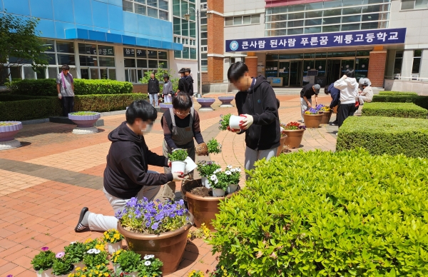 화려한 색깔과 다채로운 모양의 봄꽃으로 학생들이 직접 학교 화단을 가꾸는 활동을 통해 농심을 키우고 탄소중립 실천 방법을 학습하는 시간을 가졌다.