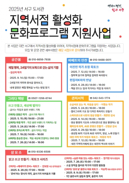 서점별 주요 프로그램으로는 △공간봄 ‘김신지 작가와의 대화’ △관저서적 ‘스마트폰으로 나만의 영상 만들기’ △그리다책방 ‘쓰고 만들고 세상에 펼치다’ △바베트의만찬 ‘이진민 작가 초청 북토크’ △삼요소 ‘읽고 쓰고 만들기’ 등이 예정되어 있다.