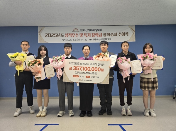 [충청뉴스큐] 아산시미래장학회는 9일 장학회 사무국에서 2025년도 성적우수 및 특기 장학생을 선발하고 장학금과 장학증서를 수여했다.
