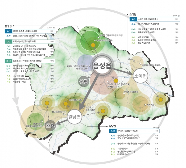 세부사업으로는 △음성읍 농촌중심지 활성화사업 △소이면 기초생활거점 조성사업 △원남면 기초생활거점조성사업 △시군역량강화사업 등이 있다.