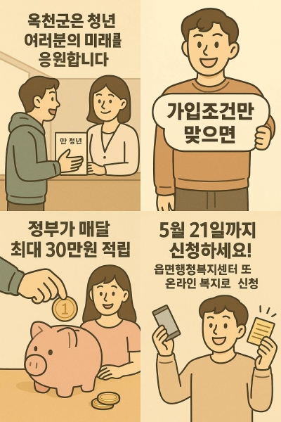 [충청뉴스큐] 옥천군이 청년의 자립과 미래 자산 형성을 지원하기 위해 '2025년 청년내일저축계좌' 신규 가입자를 오는 21일까지 모집한다.