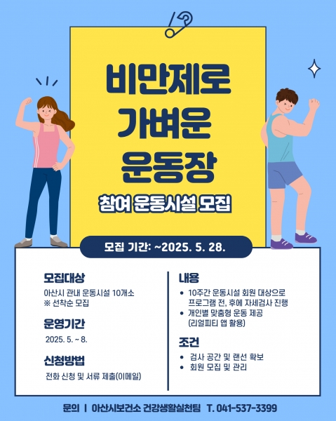 모집대상은 아산시 관내 운동시설 10개소로 오는 28일까지 선착순으로 진행되며 5월부터 8월까지 10주간 운영할 예정이다.