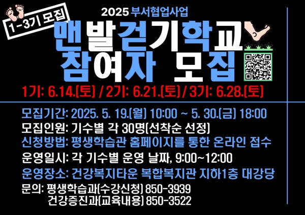하정숙 평생학습과장은 “맨발걷기학교는 간단하지만, 효과적인 건강 실천 프로그램”이라며 “보건소와 협업을 통해 시민 스스로 건강한 삶을 꾸려나갈 수 있도록 계속 지원하겠다”고 전했다.