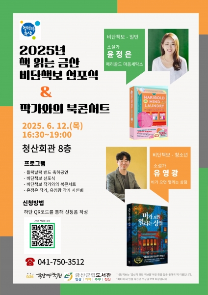 이 행사는 6월 12일 금산읍 청산회관에서 열리며 ‘메리골드 마음세탁소’ 윤정은 작가, ‘비가 오면 열리는 상점’ 유영광 작가가 출연한다.