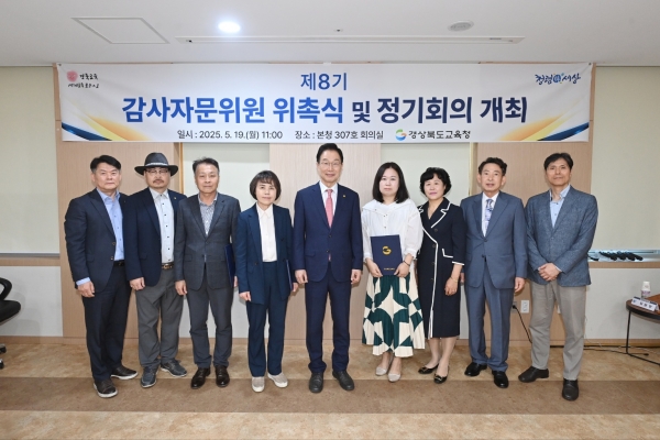 [충청뉴스큐] 경북교육청은 19일 본청 307호 회의실에서 감사 행정의 공정성과 전문성을 높이기 위한 제8기 감사자문위원회 위촉식을 개최하고 제1회 정기회의를 열었다고 밝혔다.