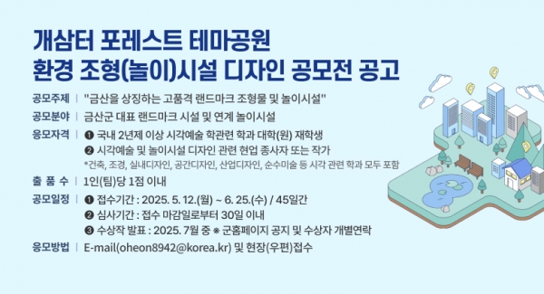 [충청뉴스큐] 금산군은 남이면 성곡리에서 추진하고 있는 개삼터 포레스트 테마공원 조성사업의 일환으로 6월 25일까지 환경조형시설 디자인 공모를 진행한다.