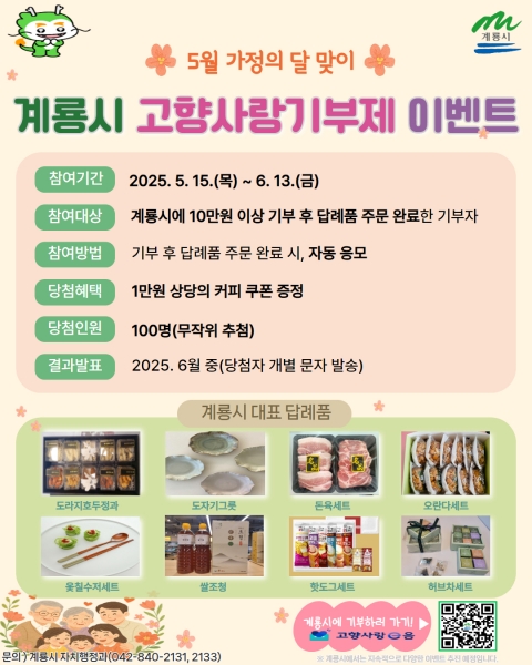 시 관계자는 “가족과 고향에 대한 의미가 더 특별해지는 가정의 달을 맞아 계룡시에 따뜻한 마음을 보내준 기부자들께 감사의 뜻을 전하기 위해 이번 이벤트를 마련했다”며 “계룡시를 사랑하는 많은 분들의 많은 관심과 참여를 바란다”고 말했다.
