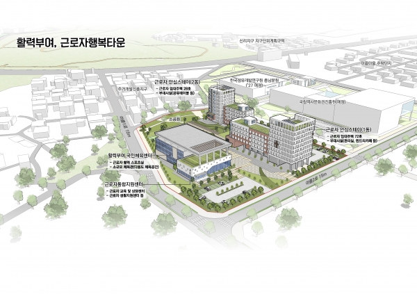 2029년까지 총사업비 268억원이 투입되는 ‘근로자 행복타운’은 규암면 오수리 아름마을지구 13,772㎡ 부지에 △근로자 안심스테이 △근로자 통합지원센터 △국민체육센터 등을 건립하는 대규모 프로젝트이다.