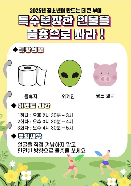참가자들은 오후 2시 30분, 3시 30분, 4시 30분 3회에 걸쳐 30분씩 물총 싸움을 즐길 수 있다.