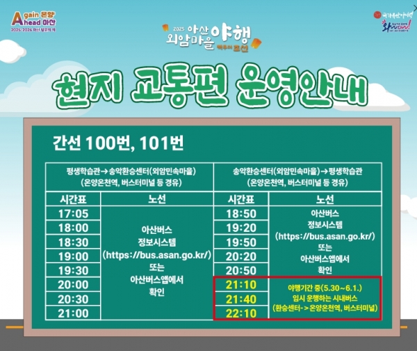 [충청뉴스큐] 아산시가 5월 30일부터 6월1일까지 열리는 ‘아산 외암마을야행’의 원활한 관람을 위해 임시주차장 3개소를 운영하고 시내버스 야간 임시 운행을 진행한다.