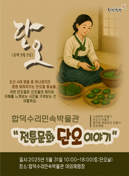 이 외에도 ‘창포 체험’, ‘합덕제 생태모자 만들기’ 등 전 세대가 함께 즐길 수 있는 프로그램이 운영돼, 단오의 의미를 되새기고 가족 간 세대 간 문화 소통의 장을 마련할 예정이다.