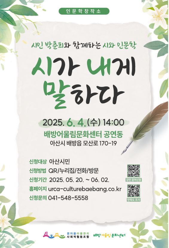 유원기 배방어울림문화센터 센터장은 “이번 강연이 일상에 지친 시민들에게 시를 통해 마음의 휴식을 얻고 삶의 아름다움을 되돌아보는 소중한 시간이 되기를 바란다”며 “앞으로도 지역 주민들의 인문학적 소양을 넓히고 문화 향유 기회를 확대할 수 있도록 다양한 프로그램을 마련하겠다”고 말했다.