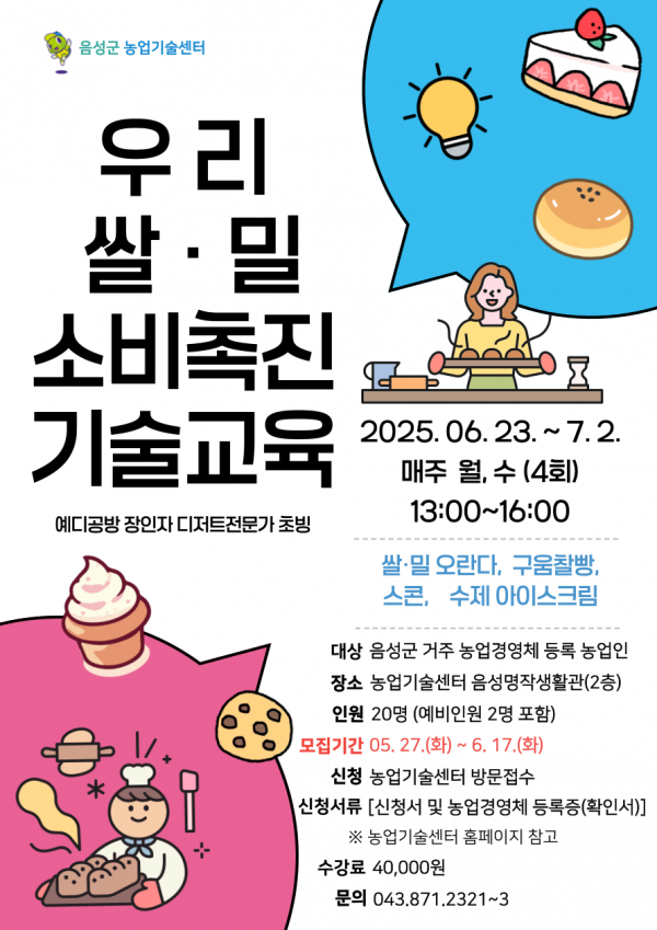 [충청뉴스큐] 음성군농업기술센터는 우리쌀과 밀에 대한 올바른 인식과 지속적인 소비를 조성하기 위해 ‘2025년 우리쌀·밀 이용 소비촉진 기술 교육’을 실시한다.