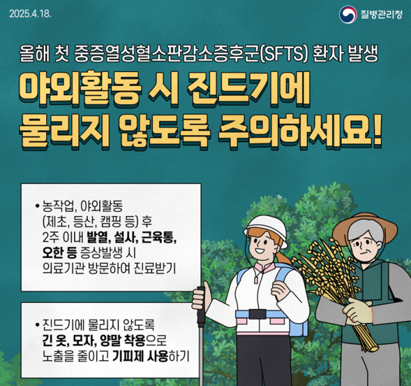 이 외에도 진드기 예방 방법을 살펴보면 △작업복과 일상복 구분해서 입기 △작업 시 소매를 단단히 여미고 바지는 양말 안으로 집어넣기 △진드기 기피제 사용하기 △풀밭 위에 옷을 벗어두거나 눕지 않기 △풀밭에서 용변보지 않기 △등산로를 벗어난 산길 다니지 않기 △작업 및 야외활동 후 옷을 털고 반드시 세탁하기 △야외활동 후 즉시 목욕하고 옷 갈아입기 △머리카락, 귀 주변, 팔 아래, 다리 사이 등 진드기가 붙어 있는지 확인하기 등이다.
