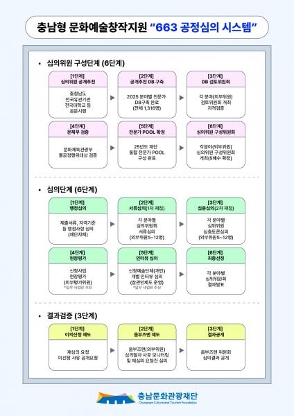 ‘663 공정 심의 시스템’은 충남문화관광재단이 개발·운영하고 있는 총 15단계의 공정성 기반 창작지원 심의 구조로 △6단계의 심의위원 구성 체계, △6단계의 본 심의 단계, △3단계의 결과 검증 체계로 구분된다.
