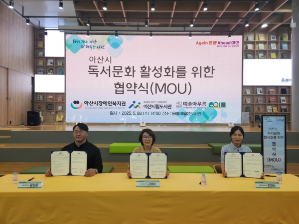 [충청뉴스큐] 아산시가 28일 음봉어울샘도서관에서 아산시장애인복지관·예술아우름과 ‘독서문화 활성화를 위한 업무협약’을 체결했다.
