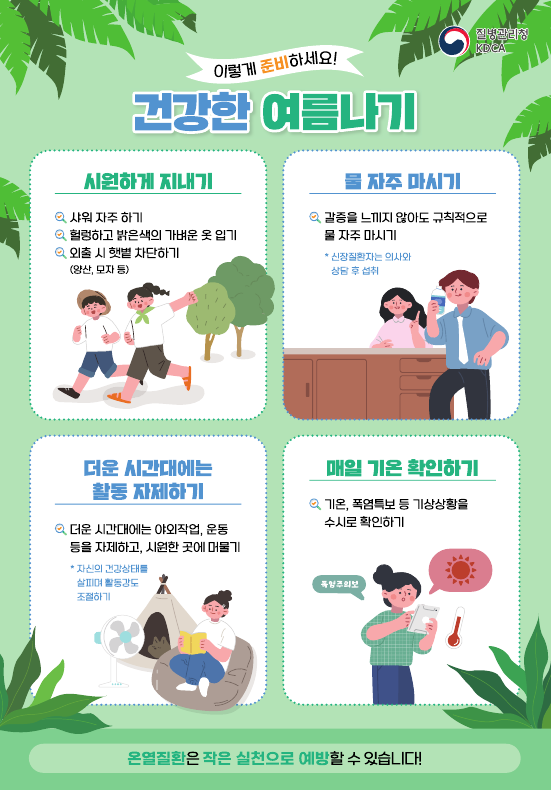 온열질환 예방수칙으로는 △시원하게 지내기 △물 자주 마시기 △더운 시간대에는 활동 자제하기 △외출 시 양산, 모자 등으로 햇볕 차단하기 △헐렁하고 밝은 색의 가벼운 옷 입기 △환자 발생 즉시 시원한 곳으로 옮긴 후 119로 신고하기 등이 있다.