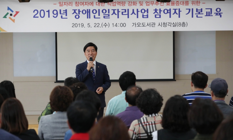 대전 동구(구청장 황인호)는 22일 가오도서관 시청각실에서 2019년 장애인일자리사업 참여자 기본교육을 가졌다“고 밝혔다. 이번 교육은 행정도우미 52명, 장애인전용주차구역 단속요원 27명 등 총 79명을 대상으로 원활하고 효율적인 업무수행에 도움을 주고자 마련됐으며, 동구 아름다운복지관 성필규 팀장이 일자리사업 전반에 관한 설명과 함께 직무 및 소양교육을 진행하였다. 특히 올해 교육은 일자리사업 전반에 관한 설명과 함께 장애인 인식개선교육 및 안전보건교육 등을 실제 사례를 바탕으로 재미있고 유익하게 실시했으며, 참석자들과의 질의·응답을 통해 평소 궁금했던 점을 해소하는 시간도 가졌다. 한편 구는 취업 취약계층인 장애인에게 장애유형별 맞춤형 일자리 제공으로 사회참여 기회를 확대하고 소득을 보장해 자립할 수 있도록 올해 17억 4200만 원의 예산으로 장애인 160명에게 일자리를 제공하고 있다. 황인호 동구청장은 “이번 교육을 통해 참여자들이 장애인일자리 사업에 대한 이해도를 높이고 업무수행 능력을 키우는 계기가 되길 바란다”며, “장애인들의 취업욕구가 높아짐에 따라 매년 일자리사업 신청자가 증가하고 있어 장애인들의 사회참여 기회를 확대할 수 있도록 적극 노력하겠다”고 말했다.