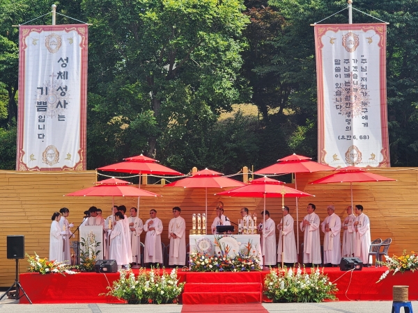 이날 야외 제대에서 미사 후 풍물패와 깃대, 성체 가마가 공세리성당 성벽길 및 마을길을 따라 이동하자 그 뒤를 600여명의 신자들이 그 뒤를 따랐다.