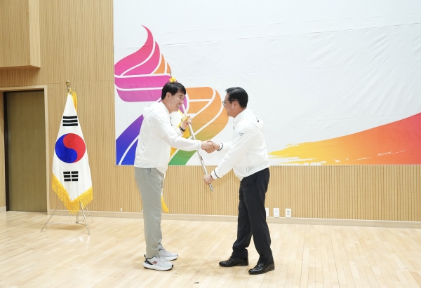 출정식은 선수단 출전 보고를 시작으로 단기 수여와 내빈 축사, 선수대표 선서 훈련 영상 상영, 우승 기원 퍼포먼스 등의 순으로 진행됐다.