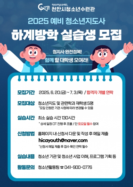 [충청뉴스큐] 천안시청소년재단 천안시청소년수련관은 다음달 3일까지 예비 청소년지도사 하계방학 실습생을 모집한다고 12일 밝혔다.