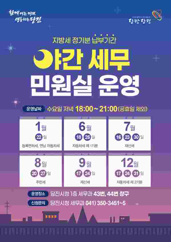 6월 야간 세무민원실은 자동차세 제1기분 납부 기간(6월 16일~6월 30일) 중, 평일 근무시간에 방문 및 문의가 어려운 시민들의 납세 편의를 위해 수요일인 18일과 25일 오후 6시부터 9시까지 3시간 동안 당진시청 1층 세무과 43번과 44번 창구에서 운영된다.