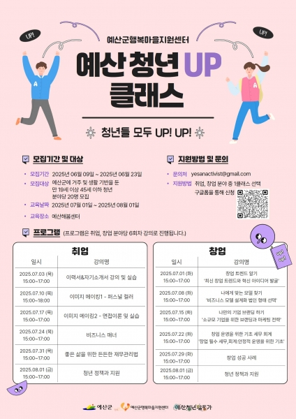 [충청뉴스큐] 예산군은 청년들의 취업과 창업 역량 강화를 위한 프로그램인 ‘청년 UP 클래스’ 참가자를 오는 23일까지 모집한다.