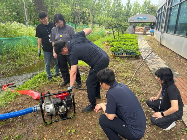 환경과학공원 계류지에서 진행된 이번 교육은 여름철 자연재난 발생 시 주로 사용되는 수방자재인 양수기, 수중펌프, 발전기의 작동법과 관리법을 익히는 데 중점을 두고 진행됐다.