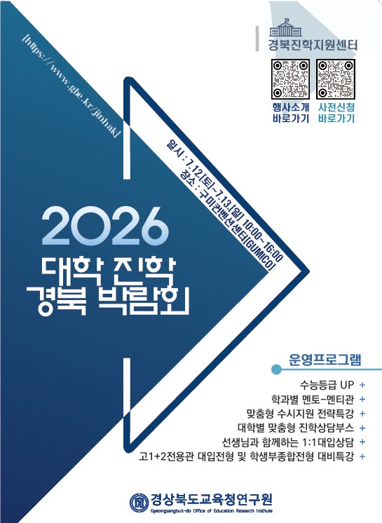 [충청뉴스큐] 경북교육청은 오는 7월 12일부터 13일까지 이틀간 구미시에 있는 구미컨벤션센터에서 ‘2026학년도 대학 진학 경북 박람회’를 개최한다고 19일 밝혔다.
