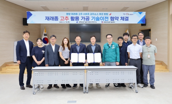[충청뉴스큐] 경상북도농업기술원은 19일 영양고추연구소와 경북전문대학교가 공동으로 개발한 영양지역 재래종 고추‘수비초’활용 ‘수비초 김치소스 제조기술’에 대해 영양군농업기술센터와 기술이전 협약을 체결했다.