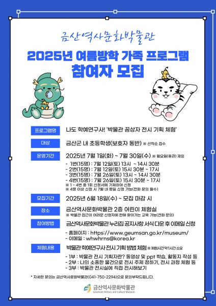 금산군에 거주하는 초교생 자녀가 있는 가족이나 기관은 누구나 금산역사문화박물관 누리집을 통해 무료로 신청할 수 있다.