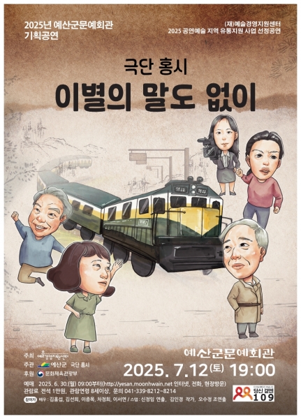 [충청뉴스큐] 예산군문예회관은 예술경영지원센터의 ‘2025 공연예술 유통지원 사업’ 공모에 선정된 작품 중 세 번째 공연으로 감성 연극 ‘이별의 말도 없이’를 선보인다.