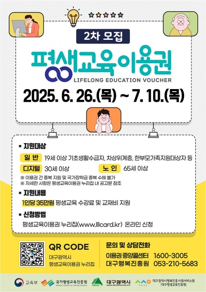 [충청뉴스큐] 대구광역시는 6월 26일부터 7월 10일까지 디지털 교육 수요자, 노인 및 저소득층을 대상으로 ‘2025년 대구광역시 평생교육 이용권’ 이용자를 2차 모집한다.