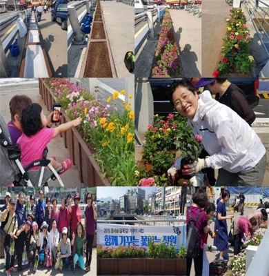 아침 9시부터 해질 무렵인 저녁 7시 까지 하루 종일 진행된 이번 행사에는 무더운 날씨에도 불구하고 유정희 부위원장을 비롯해 30명의 회원들이 참여해 도림천 위 신림 3교에서 직접 꽃을 심었다.
