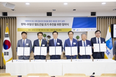 [충청뉴스큐] 경기도와 용인시, 평택시, 이천시, 안성시는 27일 오후 경기도청 상황실에서 평택~부발 철도건설 조기 추진을 위해 공동 노력하자는 내용의 업무협약을 체결했다.
