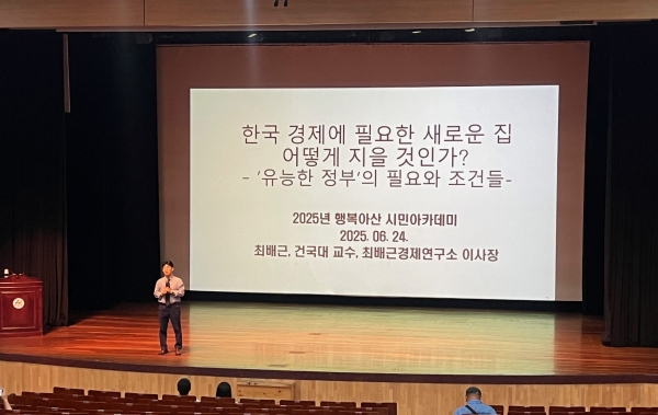 [충청뉴스큐] 아산시가 24일 평생학습관 아산아트홀에서 행복아산 시민아카데미 두 번째 강연으로 최배근 경제학 교수의 ‘한국 경제에 필요한 새로운 집, 어떻게 지을 것인가?’ 특강을 진행했다.