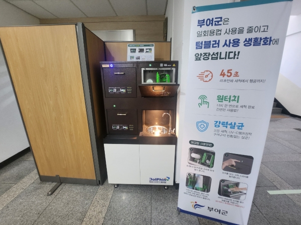 이 밖에도 일상 속 1회용품 사용 저감 문화를 확산하기 위해 군 청사 내 텀블러 세척기를 설치해 1회용품 사용 금지와 조치와 함께 직원들의 텀블러 사용을 장려하고 있다.