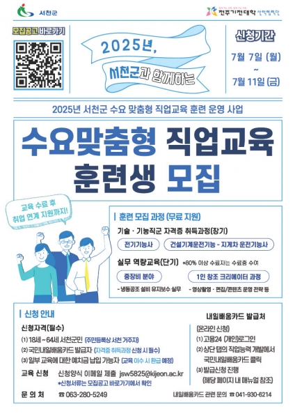 [충청뉴스큐] 서천군은 지역 정착형 고용인력 양성을 위해 추진 중인 ‘수요 맞춤형 직업교육 훈련 운영’ 사업의 교육 참여자를 오는 7일부터 11일까지 모집한다고 밝혔다.