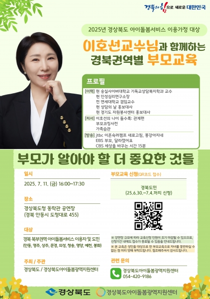 이번 교육은 7월부터 9월까지 총 3회, 권역별로 나누어 경북도청 동락관, 뱃머리평생교육관, 구미강동문화복지회관에서 진행되며 도내 아이돌봄서비스 이용자와 일반 도민 약 1,000명이 참석할 예정이다.