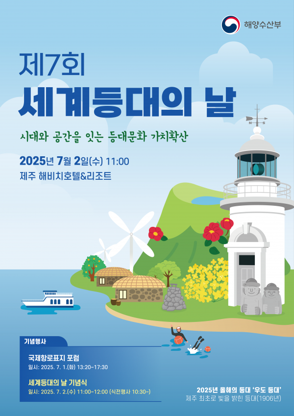 [충청뉴스큐] 해양수산부는 7월 2일 11시 해양수산부 올해의 등대로 선정된 ‘우도등대’ 가 위치한 제주에서 ’ 시대와 공간을 잇는 등대문화 가치확산’을 주제로 ‘제7회 세계등대의 날’ 기념식을 개최한다고 밝혔다.