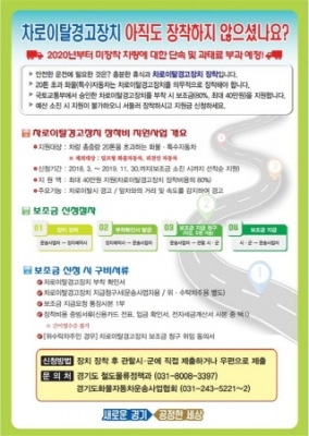 경기도에서 보조금을 지원하는 ‘차로이탈경고장치’는 자동차 전방카메라, 방향지시등 스위치, 조향각 센서를 이용해 졸음운전 등 운전자의 부주의에 의한 차로이탈을 감지, 소리 등으로 운전자에게 경고하는 장치로, 전방추돌경고장치를 포함하고 있다.