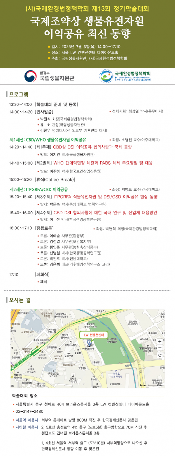 이어지는 2부에서는 △모영동 한국해양과학기술원 박사가 국가관할권 이원지역 해양생물다양성 보전 및 지속가능한 이용 협정에 대해, △박문숙 중앙대학교 법학연구원 선임연구원은 식량농업식물유전자원 국제조약의 생물 유전자원 이익공유에 대해, △이선 한국생명공학연구원 연구원은 생물다양성협약상 디지털 서열 정보 합의사항에 대한 국내 연구 및 산업계 대응 방안과 관련해 각각 발표를 한다.